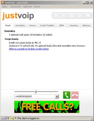JustVoip - je program od spoločnosti BETAMAX, ktorá prevádzkuje v súčasnosti okolo 20 podobných VOIP klientov, ktoré sú takmer na nerozoznanie. JustVoip, je jeden z nich a predstavuje službu s ktorou môžete volať na mobilnú a pevnú linku do celého sveta aj ZADARMO. Po inštalacií a spustení programu sa zaregistrujete a vytvoríte si vlastné konto s menom a heslom. Ako nový užívateľ získate 60 voľných minút na volanie do pevných sietí celého sveta. Po vyčerpaní limitu si musíte zakúpiť kredit v hodnote 10 euro a získate 90 dní volania ZADARMO na pevnú linku do veľkého množstva krajín sveta vrátane Slovenska, Českej Republiky, Anglicka, USA, KANADY a iných.