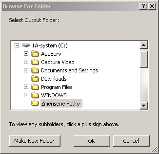 6. Predposledným krokom je určiť a vybrať výstupný adresár, kde sa skonvertované fotografie uložia. Ako prvé odporúčam si dopredu vytvoriť adresár napr. "Zmensene fotky", do ktorého sa budú ukladať všetky zmenšené, upravené fotografie a nepomiešajú sa s originálmi.